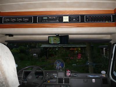 Den Kamera habe ich ganz hoch gesetzt und der Kabel lauft über das Dach, durch die Dachluke im Badezimmer und dan durch die Schränke nach vorne. Strom habe ich beim radio genommen.