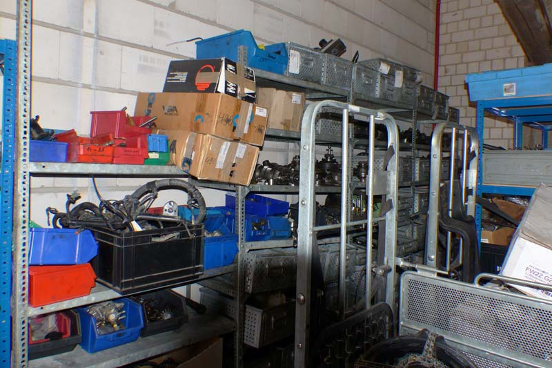 Mario hatte sich damals für diese Reparaturen jede Menge neue und gebrauchte Ersatzteile organisiert und eingelagert. Dieses Ersatzteillager ist nun konsequenterweise überflüssig, zumal Mario den Platz für Ersatzteile der Wohnmobil-Hersteller benötigt. Ich habe nachfolgend mal ein paar Fotos vom Lager eingestellt.