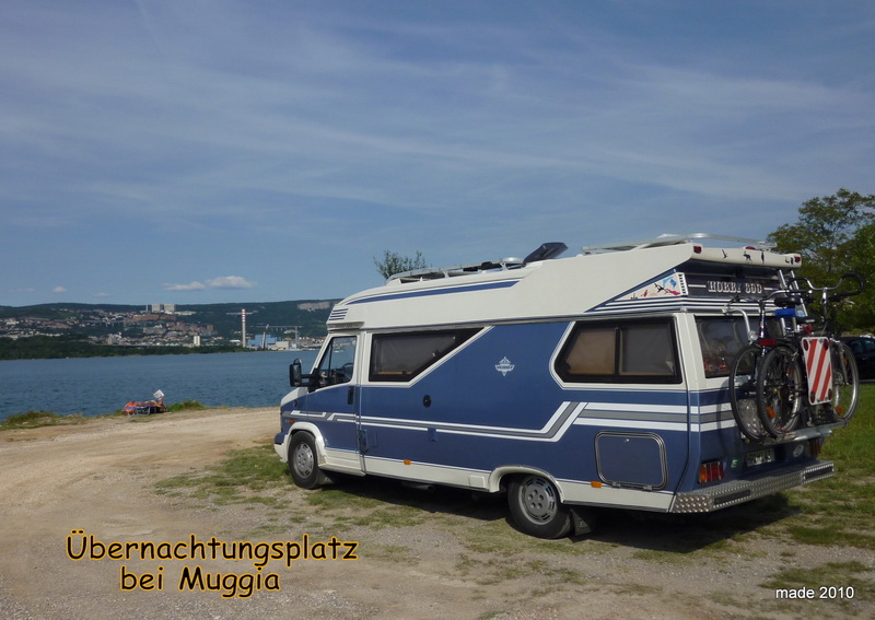 Inzwischen wurde es auch langsam Zeit, sich um einen Übernachtungsplatz Gedanken zu machen, doch durch Triest wollten wir noch durch. Das musste heute noch sein und so steuerten wir das kleine Hafenstädtchen Muggia, nur wenige Km vor der Slowenischen Grenze gelegen, an. In der Absicht, evt. am Hafen von Muggia ein Plätzchen für die Nacht zu finden, wurden wir kurz vorher angenehm überrascht. Direkt am Meer eröffnete sich ein freies Gelände, das zum Zeitpunkt unserer Ankunft von Tagesgästen, Anglern, aber auch mindestens 20 Wohnmobilen bevölkert war. Wir nahmen Kontakt zu unseren ausschließlich italienischen Kollegen auf, die uns versicherten, dass ein Übernachten hier völlig problemlos sei. Schnell hatten auch wir einen Platz eingenommen.