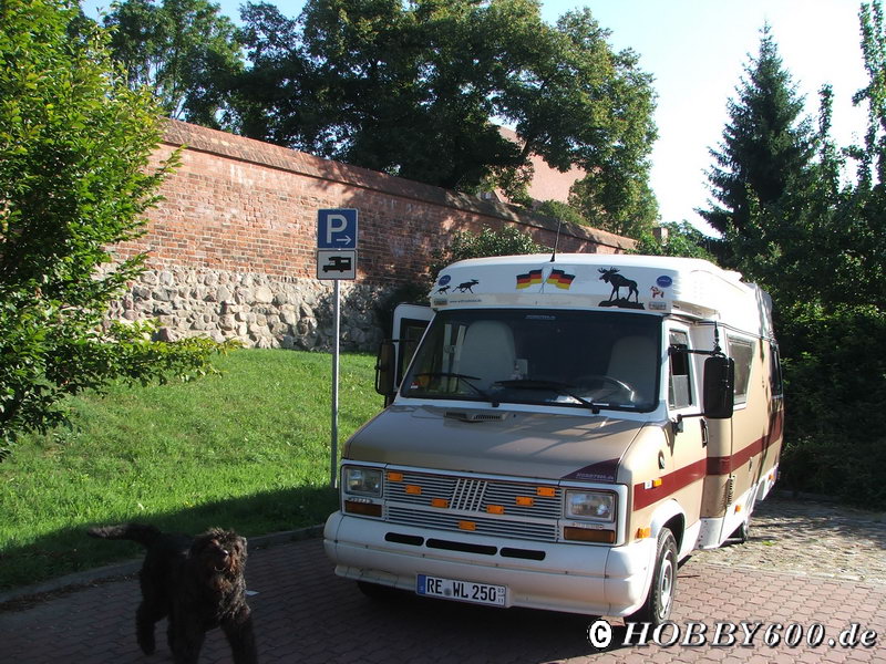 Unser Weg führte uns nach Boitzenburg. Kurz hinter Templin ließ ich ein Foto von mir am Steuer des Hobby 600 machen. Für 30 € wurde es mir nach Hause geschickt; nur weil ich etwas zu schnell vor einer Kurve fuhr.