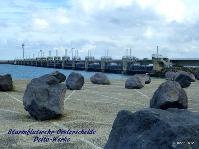 Von hier setzten wir unsere Reise über den Vrouwenpolder und den Oosterscheldedam mit seinen Deltawerken (Bild 13) nach Schouwen-Duiveland fort. Nach der großen Flutkatastrophe im Jahre 1953 wurde der Deltaplan beschlossen, der die Küstenlinie des Deltas von Rhein, Maas und Schelde durch Dämme, Deiche und Sturmflutwehre schützt. 1974 begann man mit dem Bau des Oosterscheldedammes, dessen 62 stählerne Schieber bei Sturmflut geschlossen werden können und passgenau in die Fundamente auf dem Meeresgrund "einrasten" und somit abdichten.