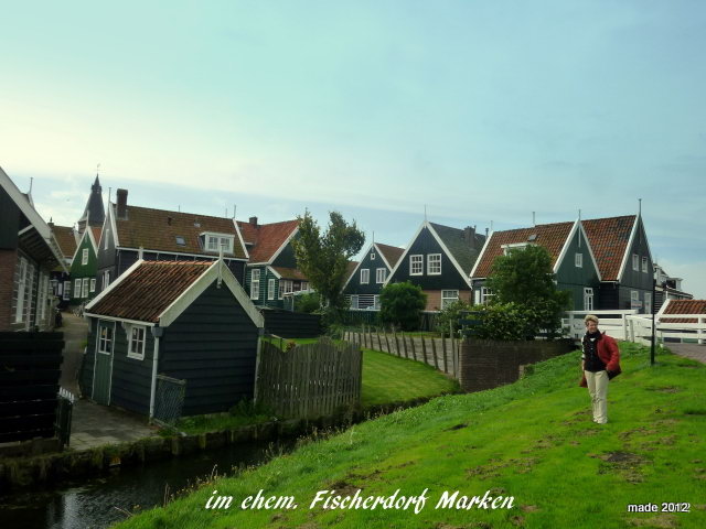 Wer möchte, kann von hier aus mit der Fähre zum ehemaligen Fischerdorf Marken, auf der gleichnamigen Halbinsel gelegen, übersetzen. Wir nutzten die Alternative und sind mit unserem Hobby von Monnickendam aus, über die Dammstraße, die die ehemalige Insel Marken heute mit dem Festland verbindet nach Marken gefahren. Das Örtchen, das mit seinen kleinen, dicht an dicht stehenden, sehr gepflegten Häuschen (Bilder 51+52),