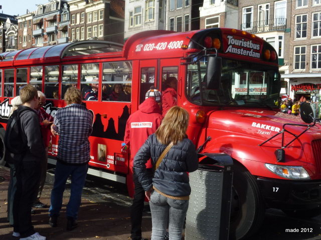 was problemlos funktionierte. An der Endhaltestelle Central Station (Hauptbahnhof) (Bild 30) sahen wir zunächst vor lauter "Bäumen keinen Wald" mehr (Bild 31), na ja, es war inzwischen kurz vor dem Marathonstart. Doch schon nach einer kurzen Orientierungsphase und ausgerüstet mit Stadtplan und -führer, machten wir uns auf Schusters Rappen auf den Weg, eine der sehenswertesten Städte Europas neben Rom, Paris, London oder Kopenhagen unsere Aufwartung zu machen, so wie es alljährlich knapp 800 000 weitere Touristen aus aller Welt auch tun (Bild 32). Warteschlangen vor den Highlights, wie z.B. dem Anne-Frank-Haus, können getrost mit denen vor dem Pergamon-Museum in Berlin mithalten. Mit etwas Phantasie und Improvisation gelang es uns aber doch, in der voller Sehenswürdigkeiten überquellenden Stadt, einen ausreichenden Überblick zu verschaffen. Dabei stehen dem Besucher die unterschiedlichsten Fahrangebote zur Verfügung, wenn die Füße mal eine "Verschnaufpause" brauchen. Neben den obligatorischen Grachtenrundfahrten, es werden drei unterschiedliche Linien (rot, blau und grün) angeboten, die alle mit einem Tagesticket nach belieben benutzt werden können (Bild 33), bieten Taxen, Busse Rikschas ihre Dienste an. Rund um die Oude Kerk (Bild 34) inmitten der Altstadt, ist man am Besten zu Fuß unterwegs. Hier, wo durch die schmalen Gässchen des Rotlichtviertels überwiegend Männer unterwegs sind, im Chinesenviertel mit seinen einschlägigen Lokalitäten (Bild 35) oder entlang der Szenekneipen (Bild 36) stehen Alternativen zu den eigenen Beinen, wie z. B. ein solcher Touristenbus (Bild 37), nicht zur Verfügung.