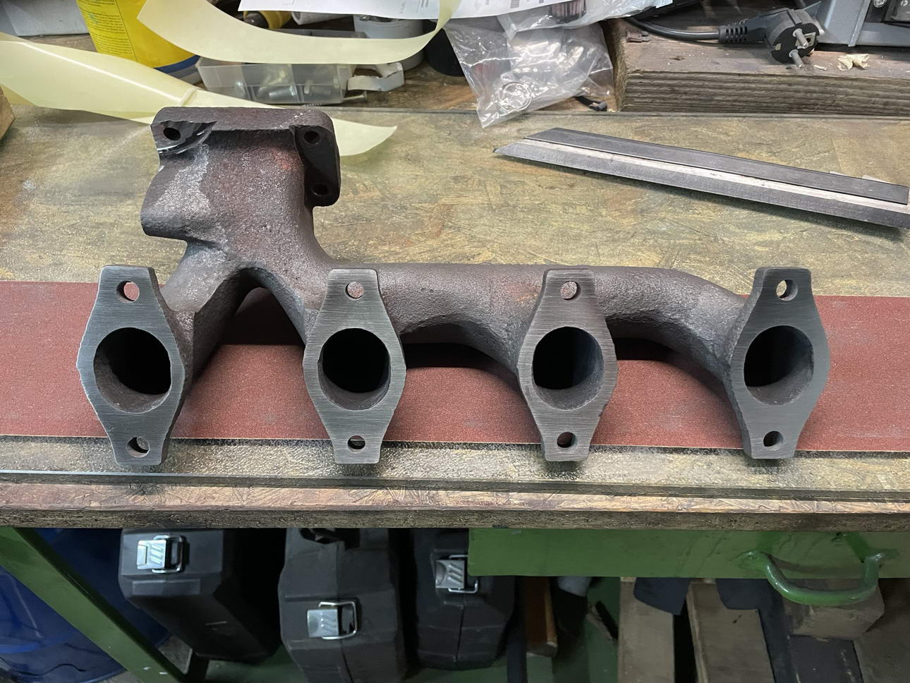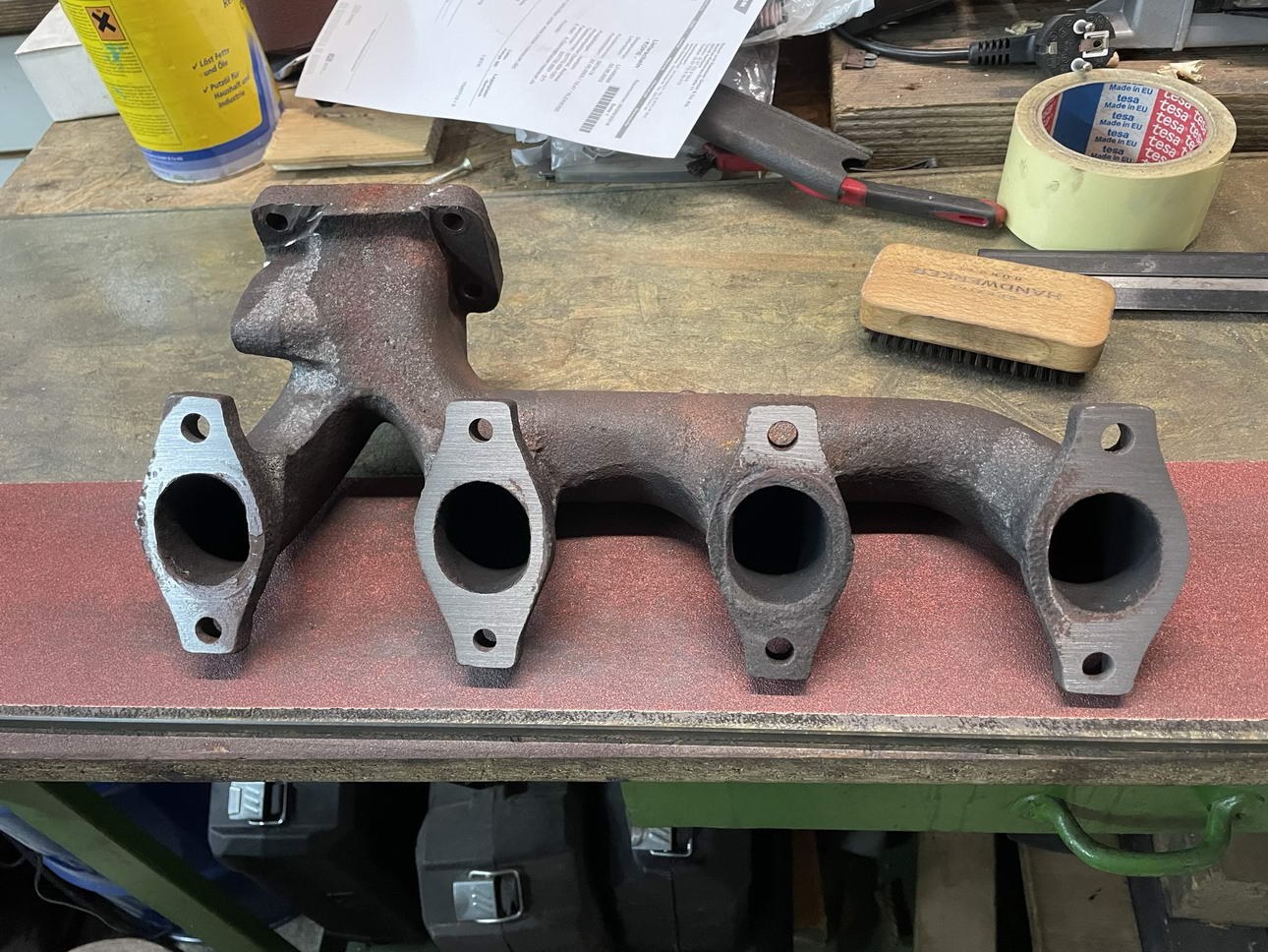 Ein neuer Krümmer ist weiterhin für den 92PS Turbo-Diesel-Motor lieferbar, war uns aber zu teuer und nicht ganz geheuer, da wir die Qualität nicht kannten. Ein gebrauchter rissfreier, den ich im Netz fand war mir lieber, da der Guss durch die bereits erfolgte Erwärmung am Motor nun spannungsärmer ist. Der Verkäufer hatte mir bereits mitgeteilt, dass er den Krümmer nur getauscht hatte, da der Flansch zum Motor nicht plan sei. Mit