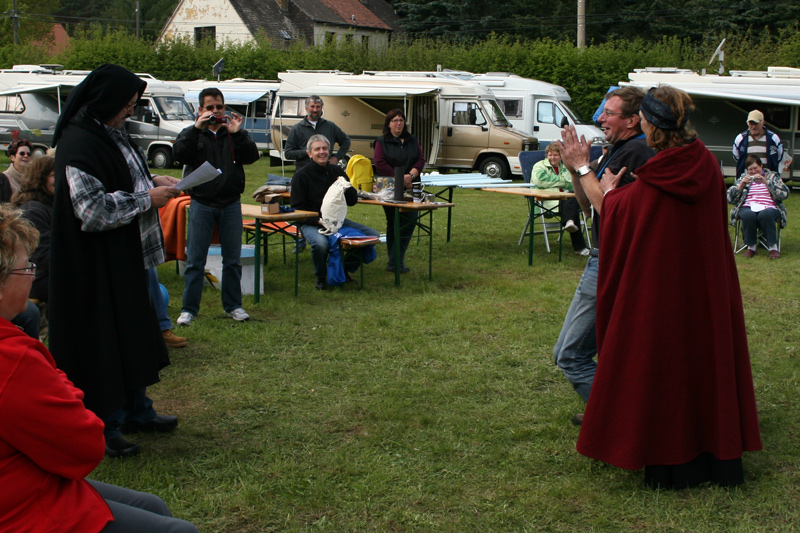 Für größeres Bild bitte klicken!Während der Siegerehrung des Treffens in Kemberg kam es völlig überraschend zu einer mittelalterlichen Gerichtsverhandlung. Plötzlich griffen mich zwei Schergen und zwangen mich auf einen Stuhl. Dann kam Richter Eddie und hielt eine Anklage vom Feinsten. Ich war so perplex, dass ich vor lauter lachen nicht mehr konnte. Am Ende bekam ich zur Strafe einen Ball!