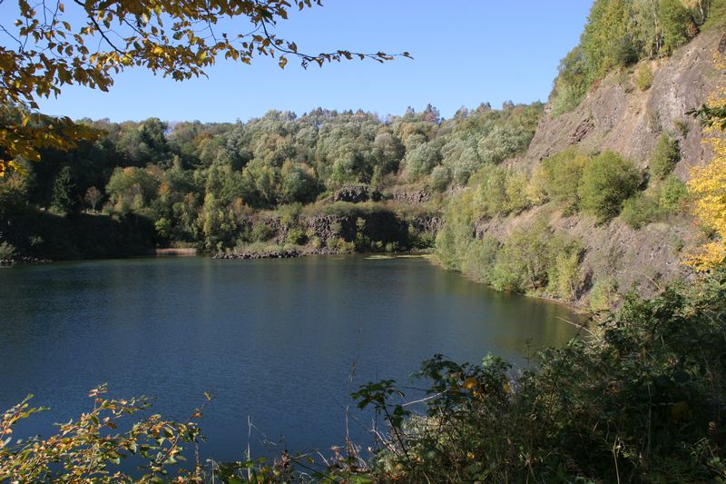 Dann wurde es auch bald dämmerig. Ich ging vorher noch eine große Runde mit dem Hund. Nahe dem Platz ist der Basalt-Park mit mittig liegendem Basalt-See. Eine Kulisse für einen futuristischen oder aber mittelalterlichen Film. Dazu die Abendsonne, die bunten Blätter, der Wahnsinn! Später fragte ich Alfred (Wille Wäller), ob man darin wohl schwimmen darf. Ich als Schwimmerin umgehe ja schon mal Verbotsschilder gerne. Er erklärte mir, was da unten im Wasser noch von den Resten des Steinbruchs von vor 100 Jahren lag, Schienen, Eisenstangen, spitze Gegenstände etc. Da wäre ich mit dem Oberschenkel womöglich irgendwo drangekommen, hätte mir die dicke Ader aufreißen können und wäre schön schmerzlos untergegangen. Nee, ich dachte daran noch abends im Bett!