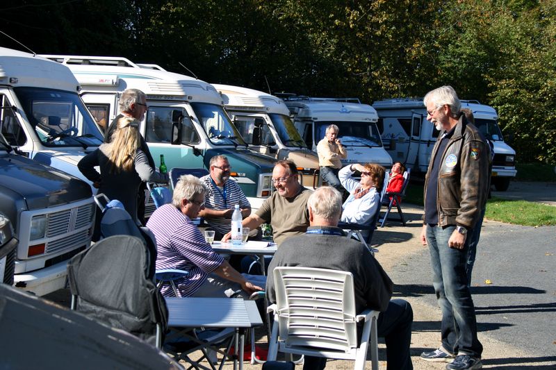 Für größeres Bild bitte klicken!Am nächsten Morgen, Sonntag, schien wieder die Sonne ins Mobil. Die Heizung konnte ich nach der kühlen Nacht ausmachen. Nach der morgendlichen Pflichtrunde mit Santos ging ich gemütlich über den Stellplatz und besuchte alle. Susanne (Fritz) saß in ihrem Mobil am Laptop. Ooh, super! So was möchte ich auch für unterwegs haben. Susanne zeigte mir Fotos, konnte ins Forum usw. Alles mit so einem Stick an der Seite. Ich bewunderte ihr vormals olles Führerhaus, was jetzt schön weiß im Lack stand! Das hatte was! Gegenüber standen Monika und Wolfgang (Buddymobil). Unterm Tisch lag unangeleint das kleine, süße Hündchen. Das liegt da brav und muss nicht gesichert werden. Wolfgang war schon wieder mit seiner Kamera beschäftigt. Stativ aufgebaut, gleich kommen die Abschiedsaufnahmen. Ob ich auch eine DVD haben wollte. Na klar! Seit Kemberg im Mai d.J. hatte unser Buddymobil über 20 Kilo abgenommen. Respekt, kann ich da nur sagen.