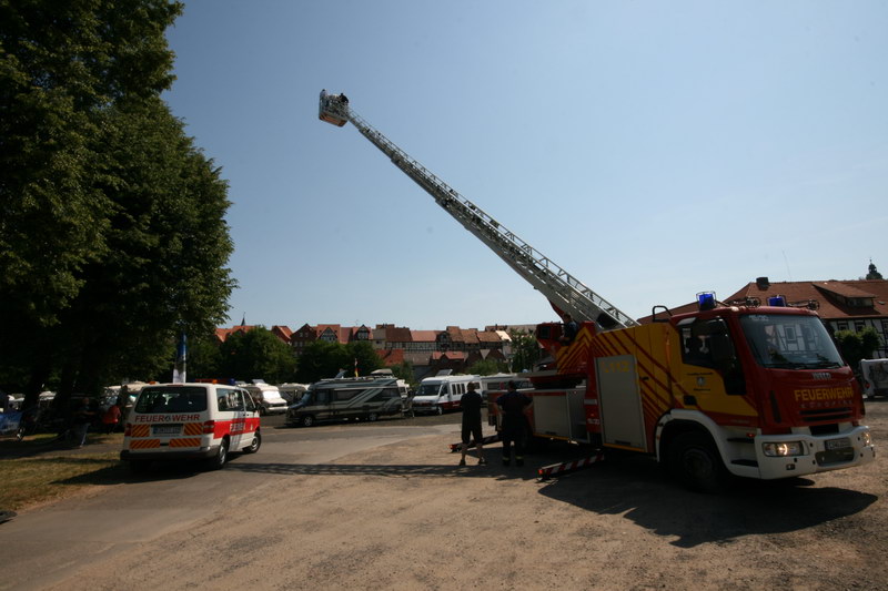 Am Samstag stand ein Ausflug in die nähere Umgebung von Bad Sooden- Allendorf auf dem Programm. Nicht umsonst nennt sich der Ort ja "Die Perle im Werra-Tal". Doch zunächst hatten wir einen Fototermin eingeplant. Dafür besuchte uns die Feuerwehr mit einem Leiterwagen am Franzrasen. Aus bis zu 30m Höhe konnten die Teilnehmer einen Blick auf den Stellplatz und die Umgebung werfen bzw. auf Speicherkarte festhalten. Das war mit Sicherheit eines der Highlights des Treffens und wird vielen noch lange in Erinnerung bleiben.