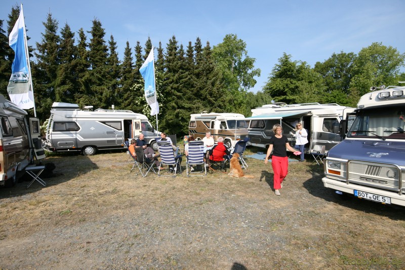 Wie schon im letzten Jahr hatte Mario für uns extra einen Platz auf dem gegenüberliegendem Betriebsgelände reserviert. Neben ein paar alten Hasen kamen auch einige Neulinge mit ihren Fahrzeugen zum Treffen, um die ein oder andere Kleinigkeit erledigen zu lassen. Hier wurde eine Drehsitzkonsole eingebaut, dort die Uhr repariert. Einer ließ sich die Spur einstellen, einer Ölwechsel machen, bei einem stand die Hauptuntersuchung an und ein weiterer wollte nur mal unter sein Fahrzeug gucken. Leider gab es auch enttäuschte Gesichter. Bei einem Fahrzeug wurde ein kapitaler Motordefekt festgestellt, so dass der Besitzer die Heimfahrt mit einem Leihwagen antreten musste. Andersrum muss man sagen, dass das ein Glück war. Besser so planmäßig reparieren lassen, als irgendwo im Urlaub liegen bleiben.